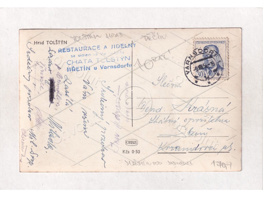 REVERS: prošlá poštou, pěkná, čistá, nepoškozená, kompletní. Známka Československo A. Z. 50h modrá + razítko p. p. Varnsdorf 1+ pěkné propagační, reklamní, podnikové razíto Restaurace a Jídelna Varnsdorf "Chata Tolštýn" Jiřetín u Varnsdorfu. Posláno z Varnsdorfu do Plzeň, Korandova ul., paní Vendula Krásná, Státní spořitelna v Plzni