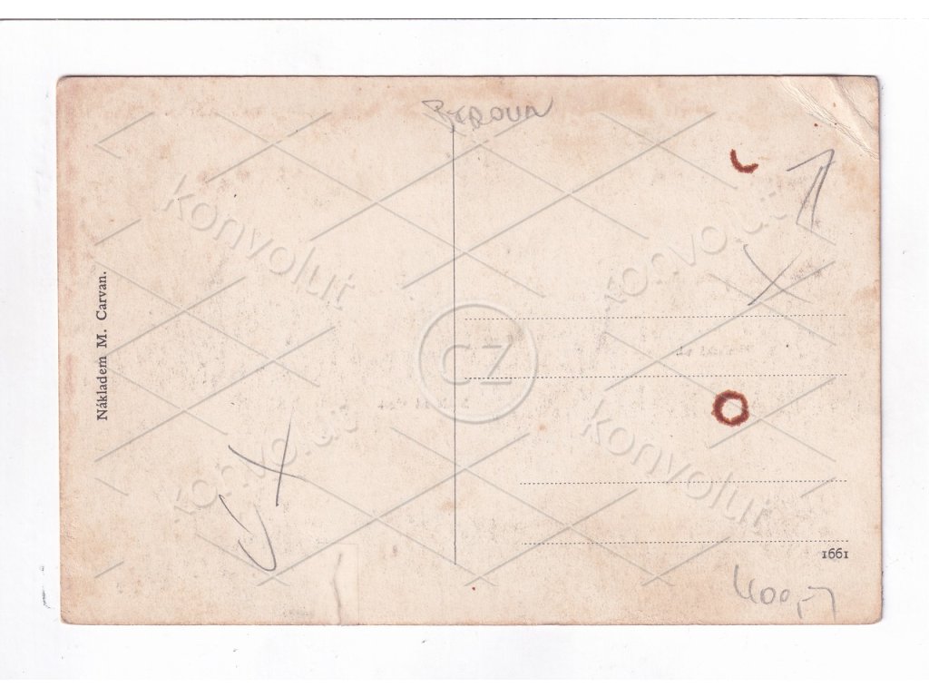 Pohlednice je velice pěkná, zásadně nepoškozená. Levý horní růžek namáčknutý, uprostřed dole vpravo natržená hrana cca 1cm (ošetřeno), mírně omšelé a místy osahané hrany. Obrazová část je velice pěkná, nepoškozená, čistá, velmi dobře čitelná, velmi dobrý soutisk, mnoho zajímavých detailů.
