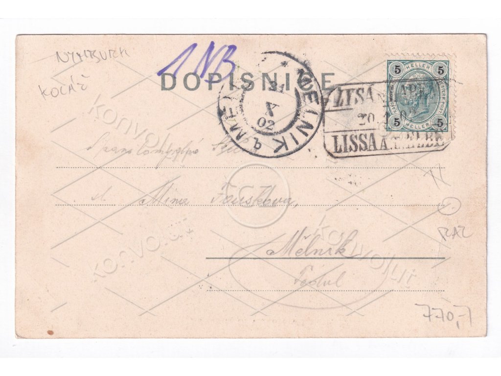 REVERS: DA, RU, KuK, prošlá poštou, pěkná, čistá, kompletní. Vepsána poznámka - fialově "1NB". Známka RU Heller 5H šedozelená + razítko p. p. NS - nádražní schránka Lissa an der Elbe + razítko d. p. Mělník. Posláno v X/1902 z LnL do Mělník, paní Mína Fousková.