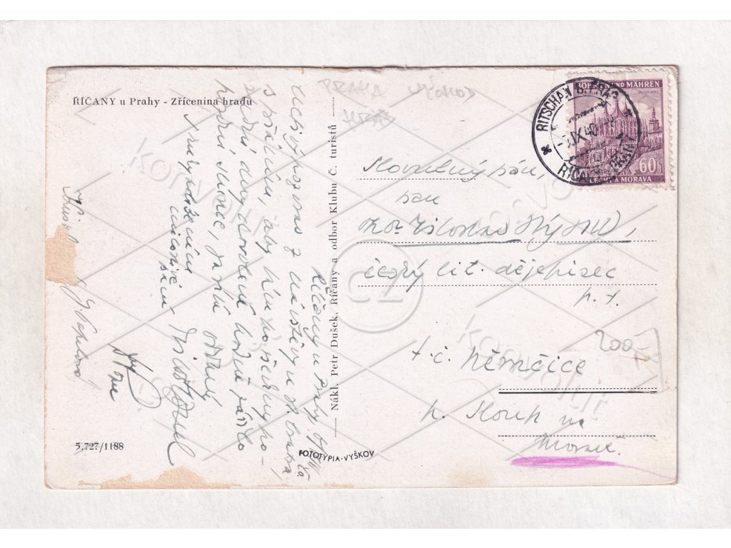 REVERS: protektorát BuM, prošlá poštou, pěkná, čistá, nepoškozená, kompletní. Známka BuM KH 60H fialová + razítko p. p. BuM Říčany u Prahy Ritschan b. d. Prag. Posláno v IX/1940 z Říčan do Němčice, Blansko, Sloup na Moravě, pan PhDr. Miloslav Rýna, literární dějepisec